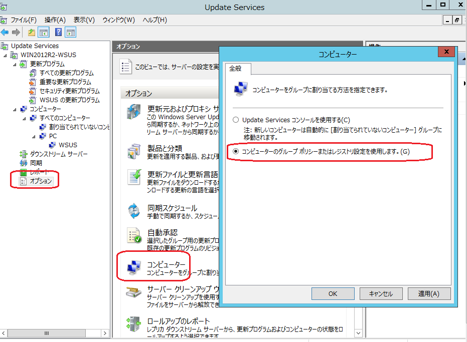 クライアントPCをWSUSサーバでどのようなグループに割り振るかを決める方法を選択する。