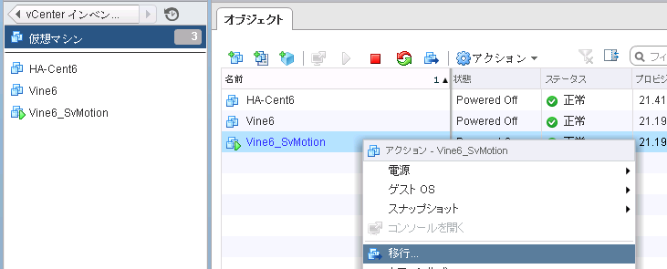 仮想マシンを起動したまま、仮想PF間を移動させることができる