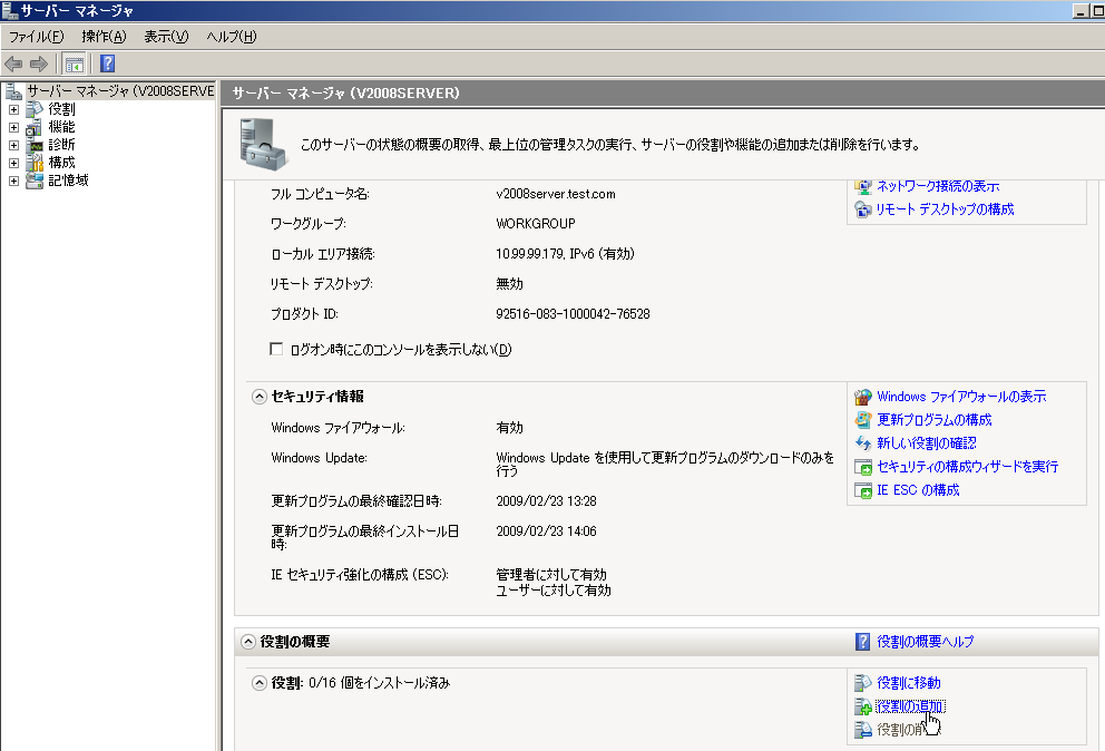 サーバマネージャの「役割の概要」=>「役割の追加」を選択する