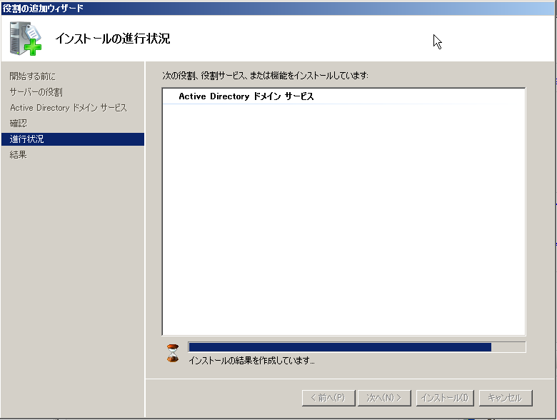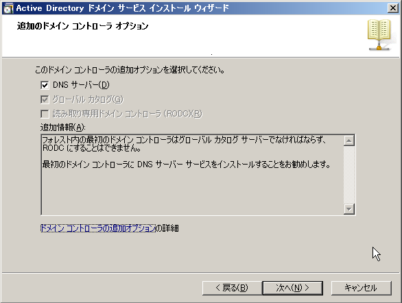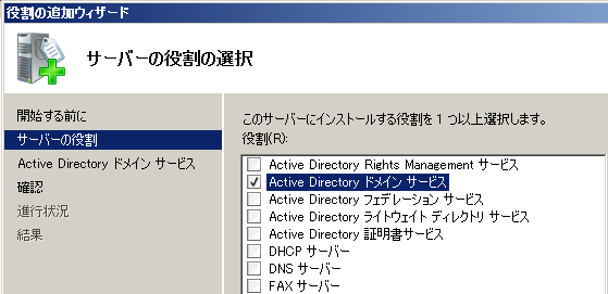 サーバの役割の選択では「Active Directory ドメイン サービス」だけを追加する。