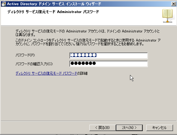 ディレクトリ復元モードのAdministratorのパスワードを入力