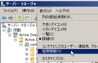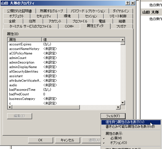 LDAP内容の確認はサーバマネージャから以下のように、拡張機能を有効にして、確認ユーザを右クリックし、「属性エディタ」タブの「フィルタボタン」で値を持つ属性を表示させると内容がわかる。