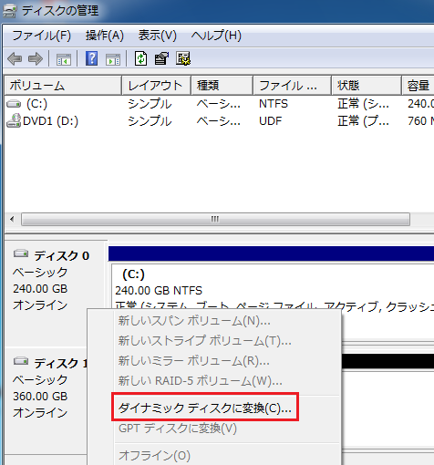 ディスクの管理から「ディスク0」を右クリックしダイナミックディスクに変換を選択