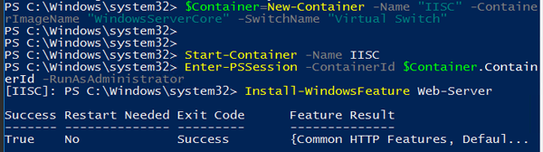 PS C:\Windows\system32> $Container=Get-Container -Name IISC PS C:\Windows\system32> Enter-PSSession -ContainerId $Container.ContainerId -RunAsAdministrator