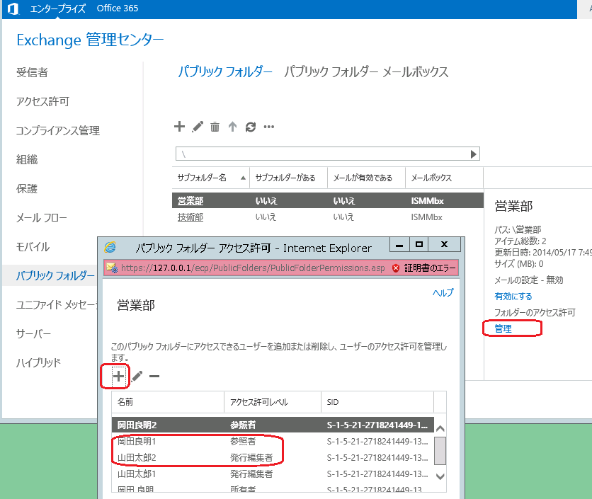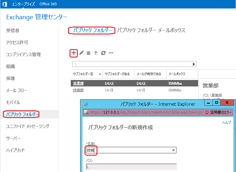 - Exchange管理センターのパブリックフォルダ->パブリック フォルダー メールボックス
