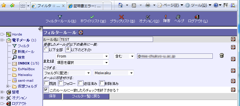 これでメニューのフィルタでブラックリスト等が登録できる。使用方法は登録後、メニューバの更新ボタンの横のフィルタ適用ボタンを押す。(自動振り分けは無理みたい)