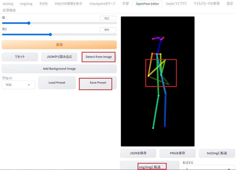 完成後「img2img転送る」又は、「Save Preset」で保存する