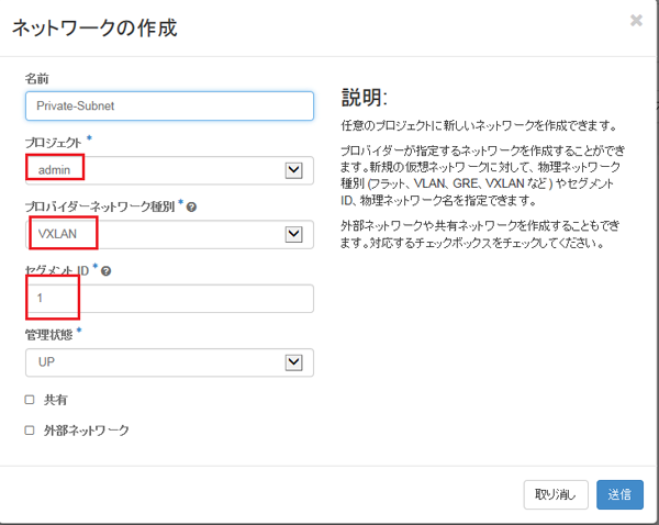 [root@openstack-mitaka ~(keystone_admin)]# neutron net-create public --tenant-id e3ca6100bb5a4172bf51f809595d879c --router:external Created a new network: +---------------------------+--------------------------------------+ | Field | Value | +---------------------------+--------------------------------------+ | admin_state_up | True | | availability_zone_hints | | | availability_zones | | | created_at | 2016-07-30T07:27:37 | | description | | | id | cab789fb-0a38-476b-98eb-028dc0f8dc10 | | ipv4_address_scope | | | ipv6_address_scope | | | is_default | False | | mtu | 1450 | | name | public | | provider:network_type | vxlan | | provider:physical_network | | | provider:segmentation_id | 100 | | router:external | True | | shared | False | | status | ACTIVE | | subnets | | | tags | | | tenant_id | e3ca6100bb5a4172bf51f809595d879c | | updated_at | 2016-07-30T07:27:37 | +---------------------------+--------------------------------------+