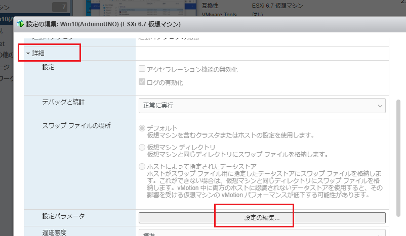 仮想マシンの編集→「仮想マシンオプション」→「詳細」
