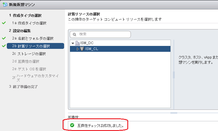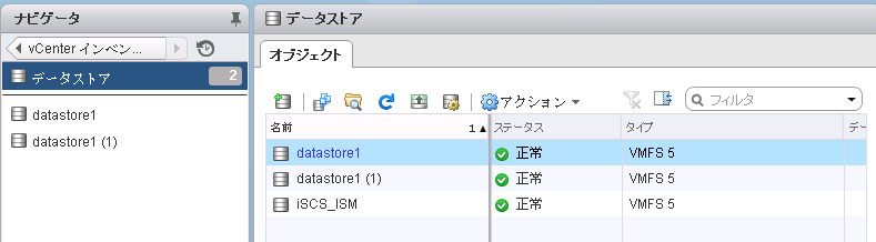 同様にvmesxi6-2.ism21.netも作成 データストアの作成(削除) †データストアにはホストに登録されたストレージが見える。iSCSI以外は使用しないので削除してもよい(今回は削除しなかった) ただし事前にESXiでiSCSIをストレージとして認識させておく クラスタの作成(ホストをまとめてクラスタにする) †
